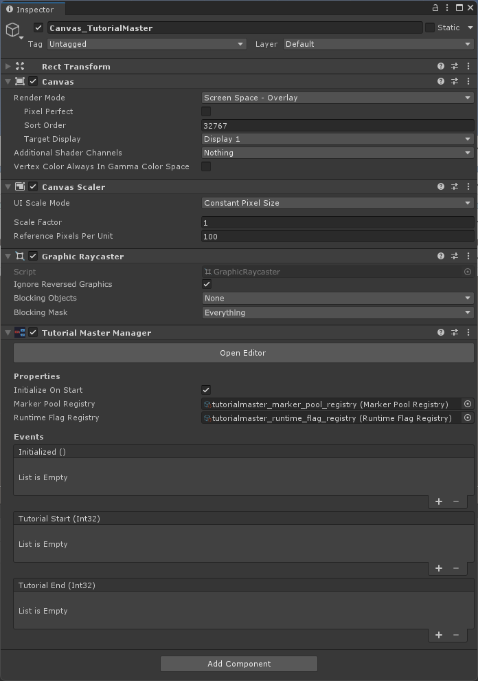 To create it, select Create > Tutorial Master > Runtime Flag Registry. Give your asset a name and assign it to the Tutorial Master Manager component.